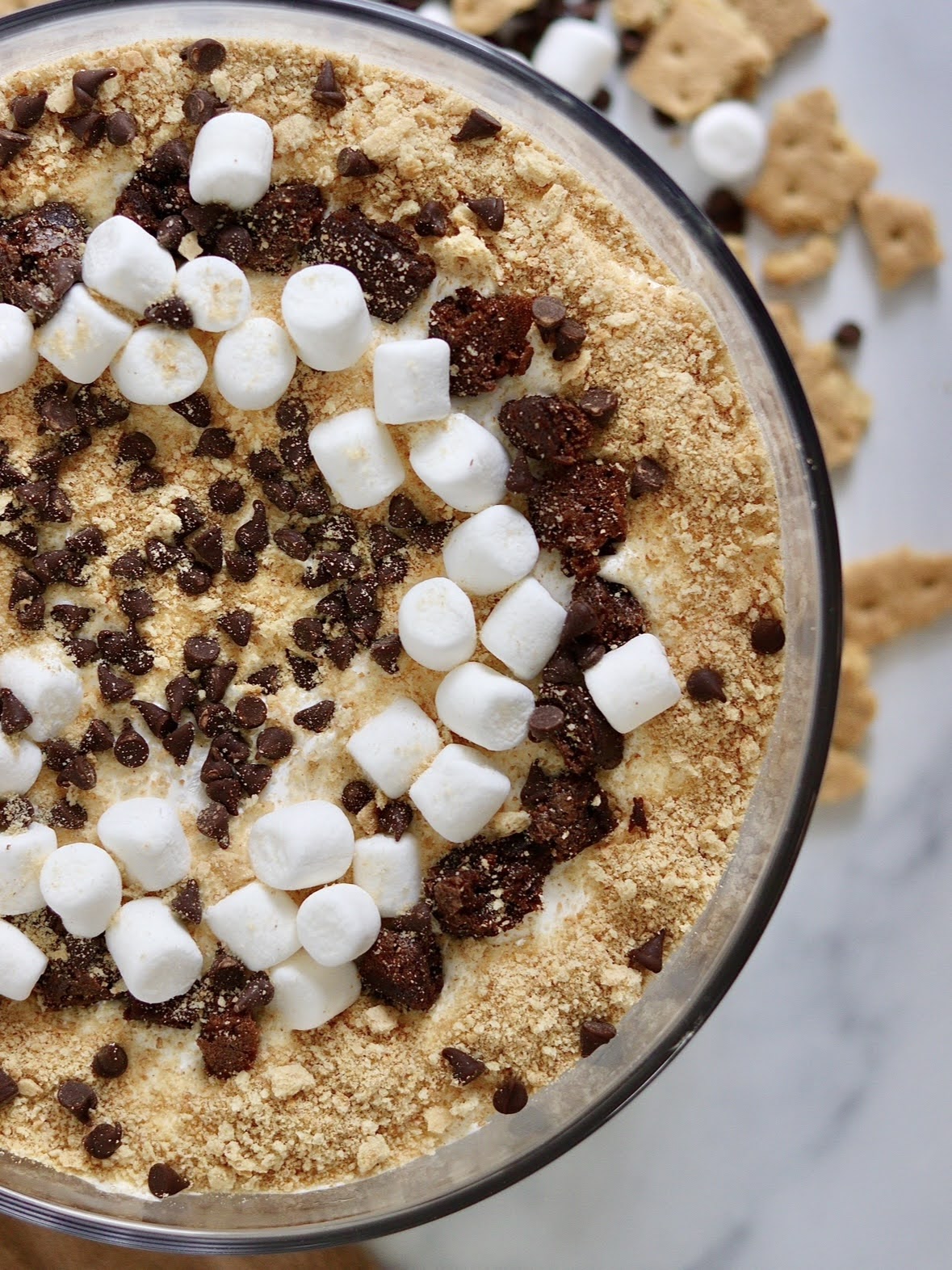This easy s’mores trifle is packed with marshmallow cream, crushed graham crackers and brownie bits.